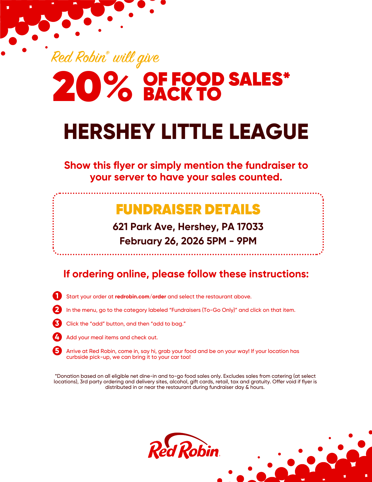 Hershey Little League will receive 20% of fundraiser sales* during this fundraiser. Participate on Feb 26th, 2026 during the scheduled fundraiser time by showing the flyer below to your server at this Red Robin location, or by ordering online at redrobin.com or on the Red Robin mobile app. For online and mobile app orders you must add the fundraiser to your cart before you check out for the sales to count towards the fundraiser.